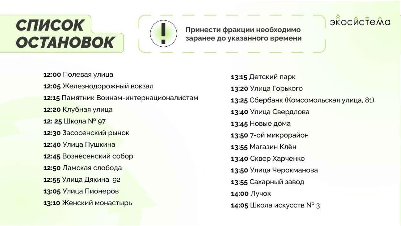 Ельчане смогут сдать на переработку пластик, бумагу, текстиль, электронику и блистеры от таблеток. С 12:00 до 14:05 автобус сделает 24 остановки. Маршрут стартует от остановки «Полевая улица» и финиширует у «Школы искусств №3».