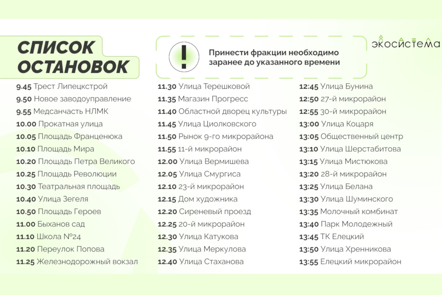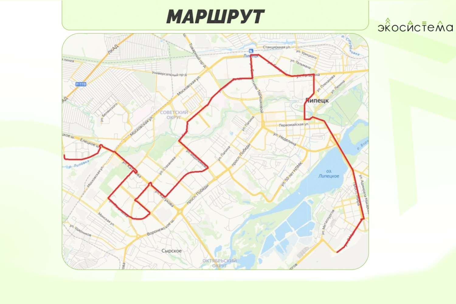 Маршрут начнётся с остановки «Трест Липецкстрой» и завершится в микрорайоне Елецкий. По пути следования липчане смогут сдать на переработку ненужную электронику, пластик, текстиль, бумагу. В шести точках пройдут интерактивные мастер-классы, где горожане узнают больше о раздельном сборе отходов.
