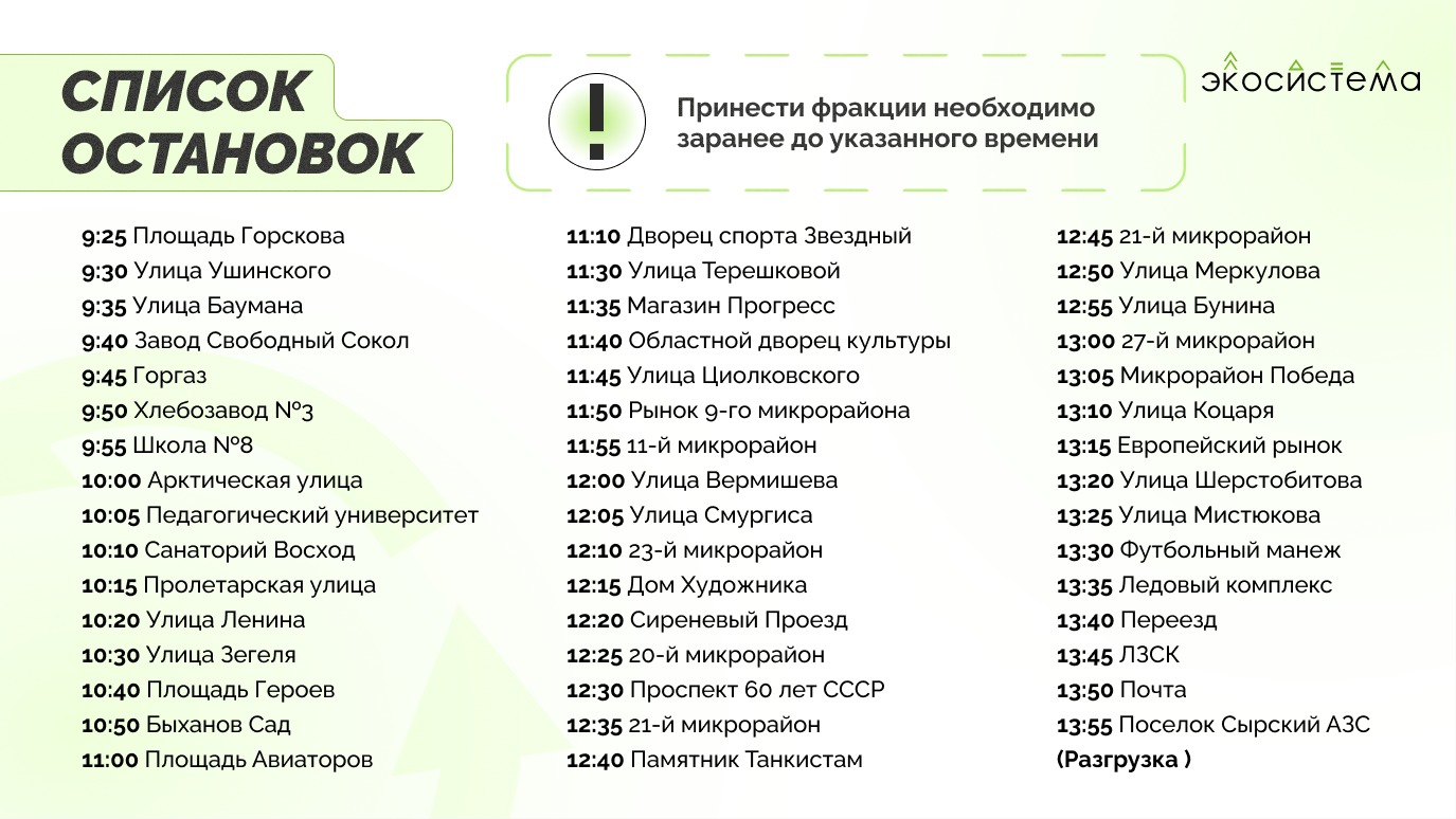 В пути «Зелёный автобус» будет около 5 часов, за это время он проедет через весь город, по улицам Ленина, Гагарина, Космонавтов, Водопьянова, проспект 60 лет СССР, микрорайон Европейский и Сырский Рудник.