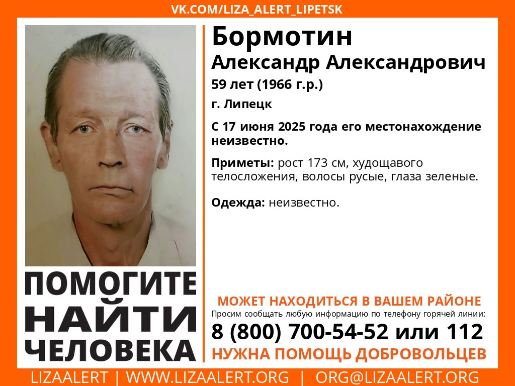17 июня в Липецке пропал 59-летний Александр Александрович Бормотин. Рост – 173 см, худощавого телосложения, русые волосы, зелёные глаза. Во что был одет, неизвестно.