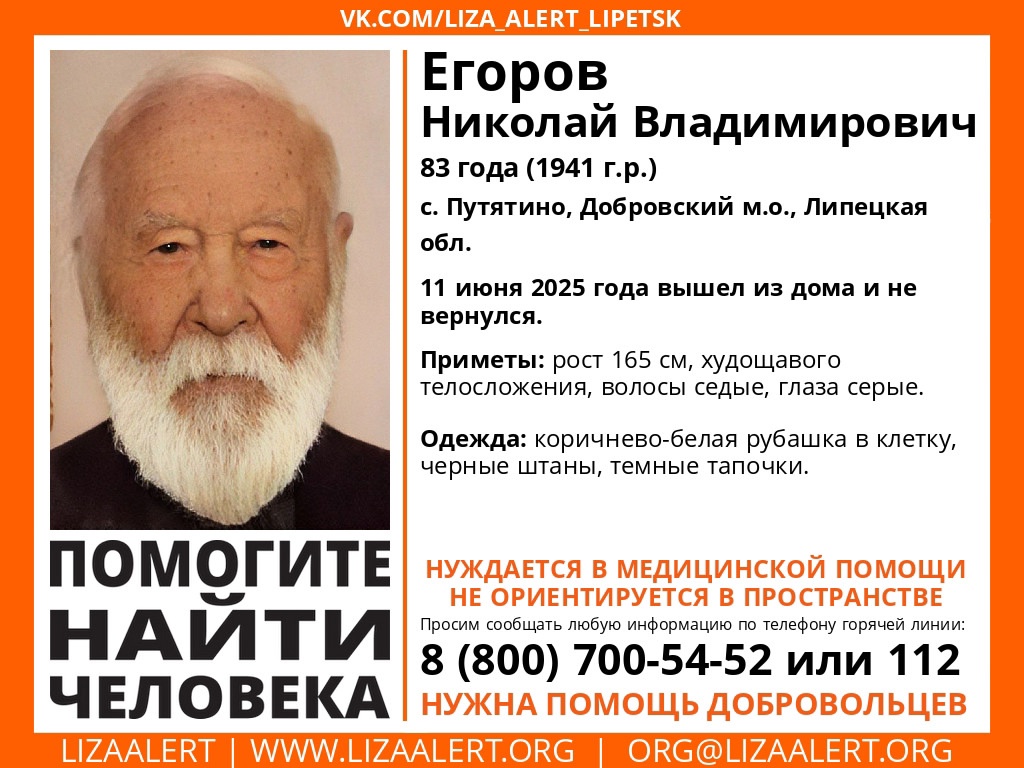 Днём ранее, 11 июня, в селе Путятино Добровского округа пропал 83-летний Николай Владимирович Егоров. Рост мужчины – 165 см, худощавого телосложения, седые волосы, серые глаза. Был одет в коричнево-белую рубашку в клетку, чёрные штаны и тёмные тапочки. Поисковики сообщают, что Николай нуждается в медицинской помощи и не ориентируется в пространстве.