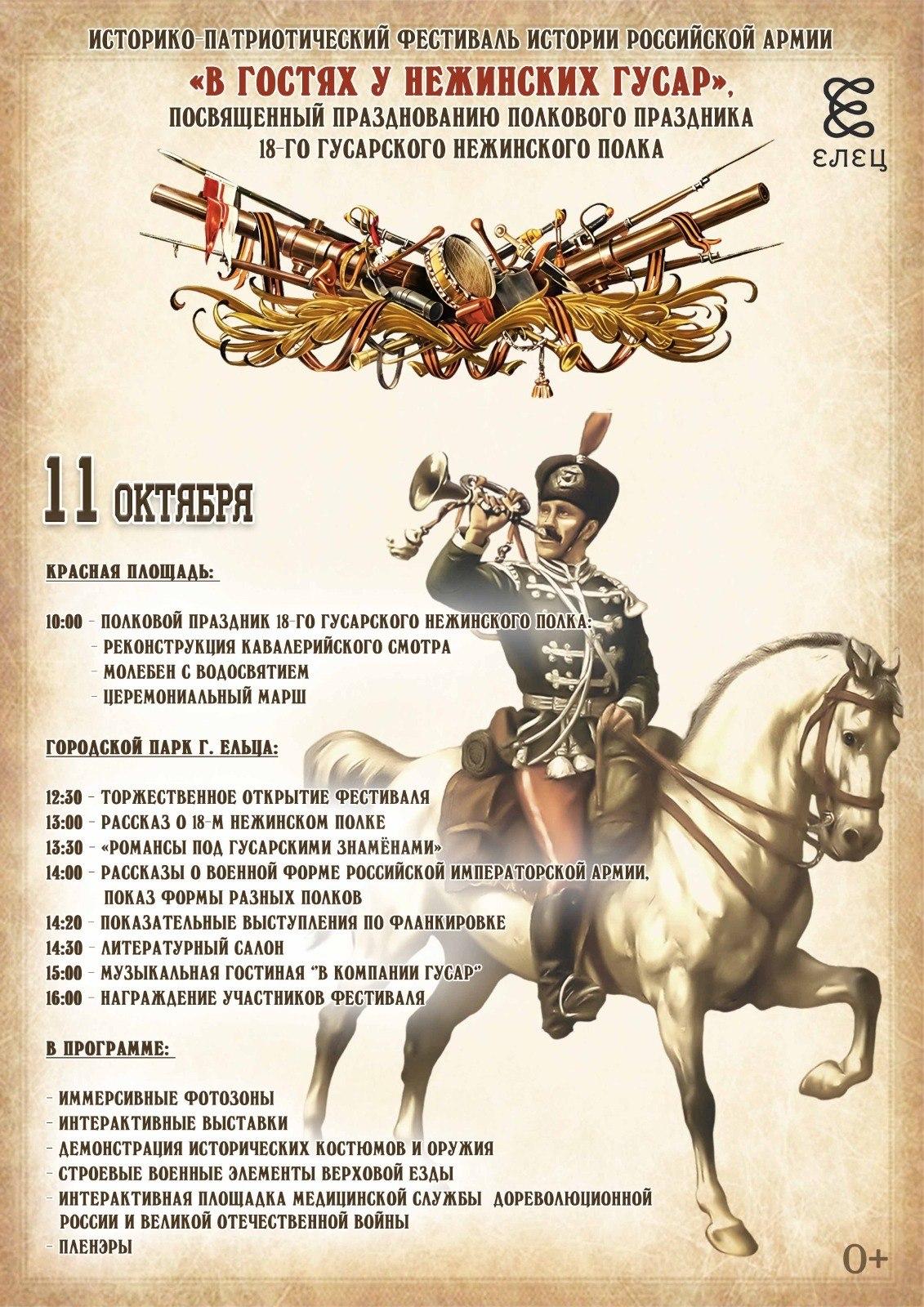 Жителей Ельца и гостей города 11 октября приглашают на фестиваль «В гостях у Нежинских гусар», посвящённый празднованию полкового праздника 18-го гусарского Нежинского полка.